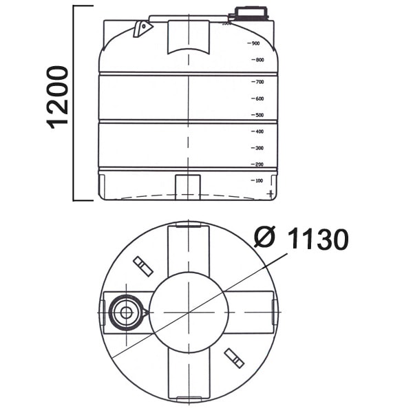 Емкость имеет вертикальную цилиндрическую форму, позволяющую хранить значительный объем жидкости на небольшом пространстве. Горловина расположена сбоку верхней площадки, что упрощает заполнение бака.