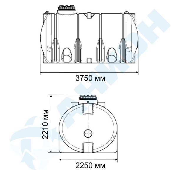 Плоские площадки внизу торцевых поверхностей емкости позволяют устанавливать вварные патрубки ВПDN100 для подключения сливных шлангов и труб Ду=100 мм.