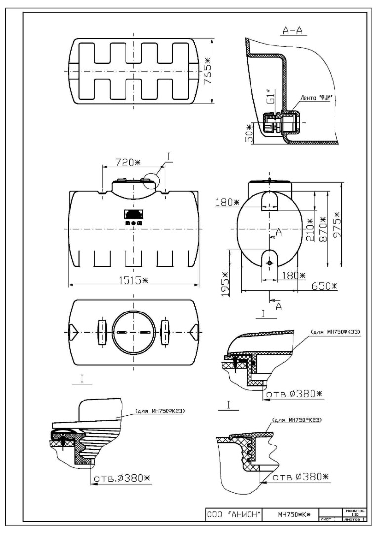 Емкость цилиндрическая горизонтальная 750 литров с дыхательным клапаном и сливом