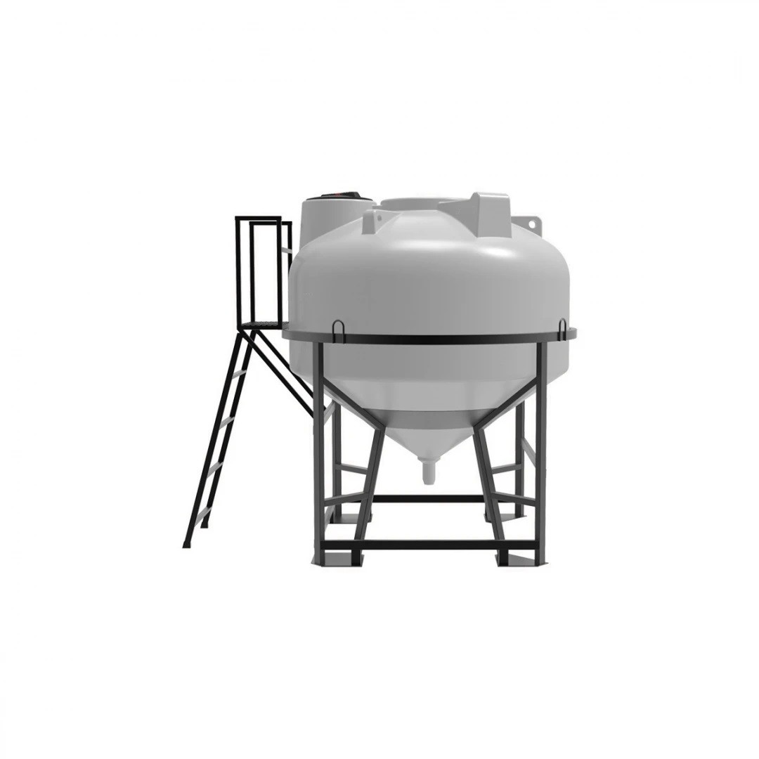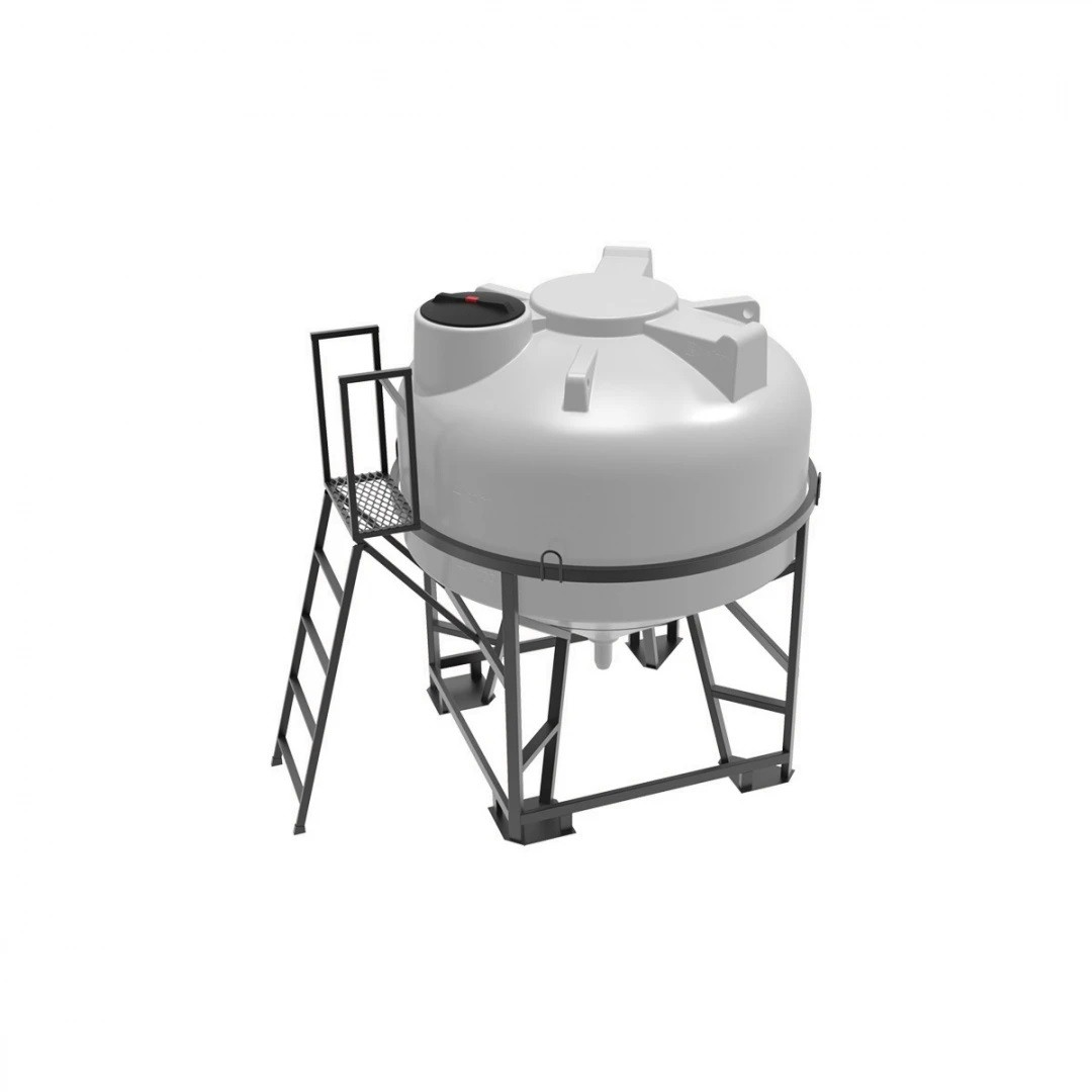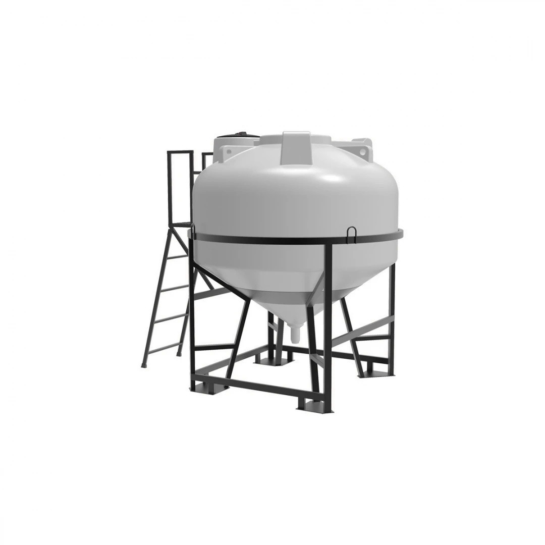Емкость ЦКТ объемом 3000 литров с патрубком в обрешетке с лестницей – крупногабаритный цилиндрический резервуар с конусным дном, обеспечивающим дозированную подачу и полный слив хранящихся веществ.