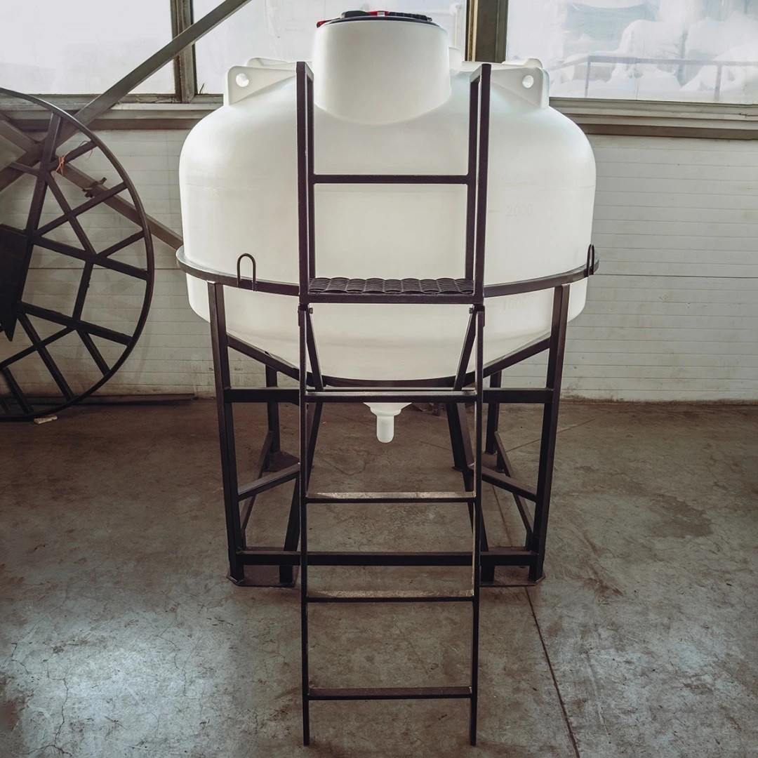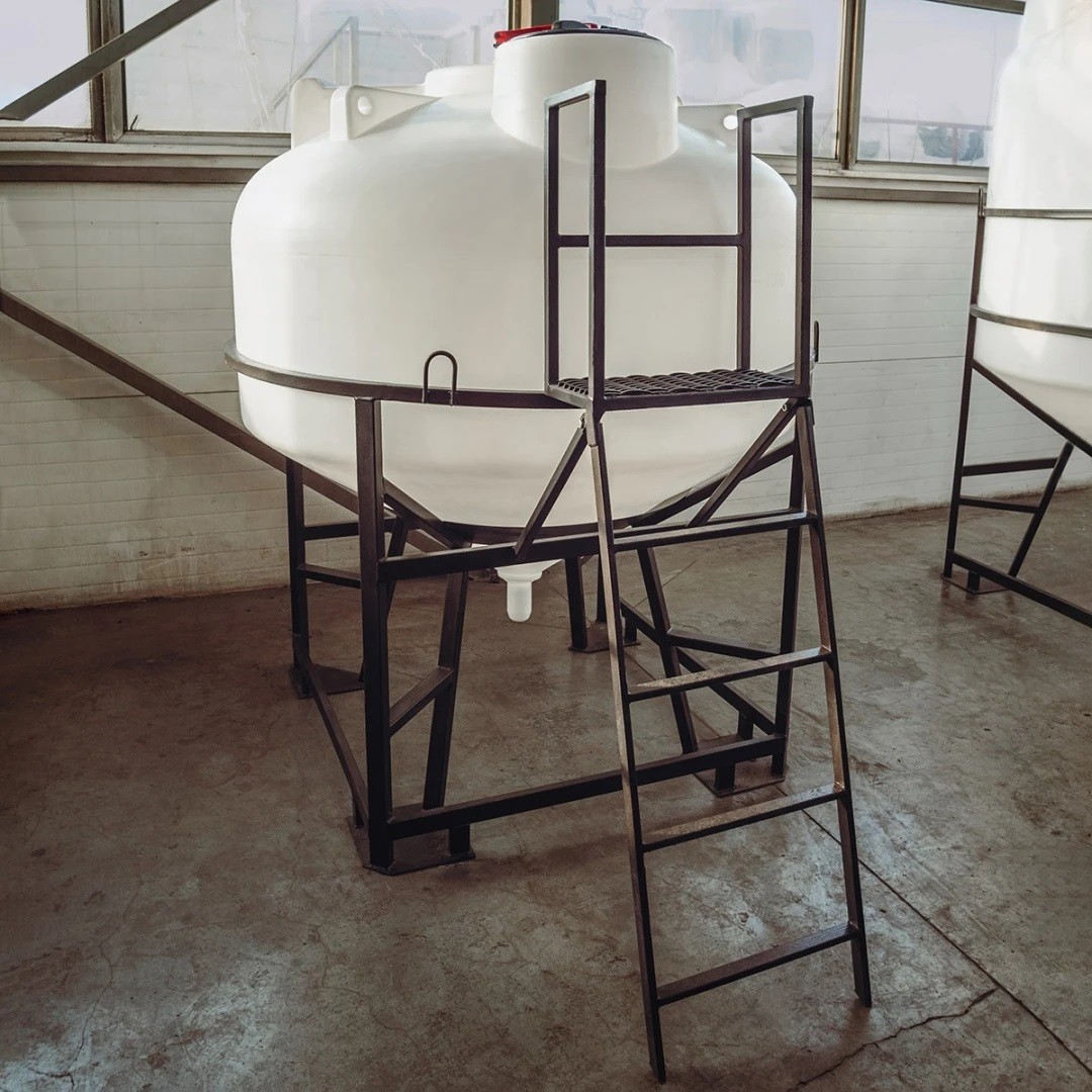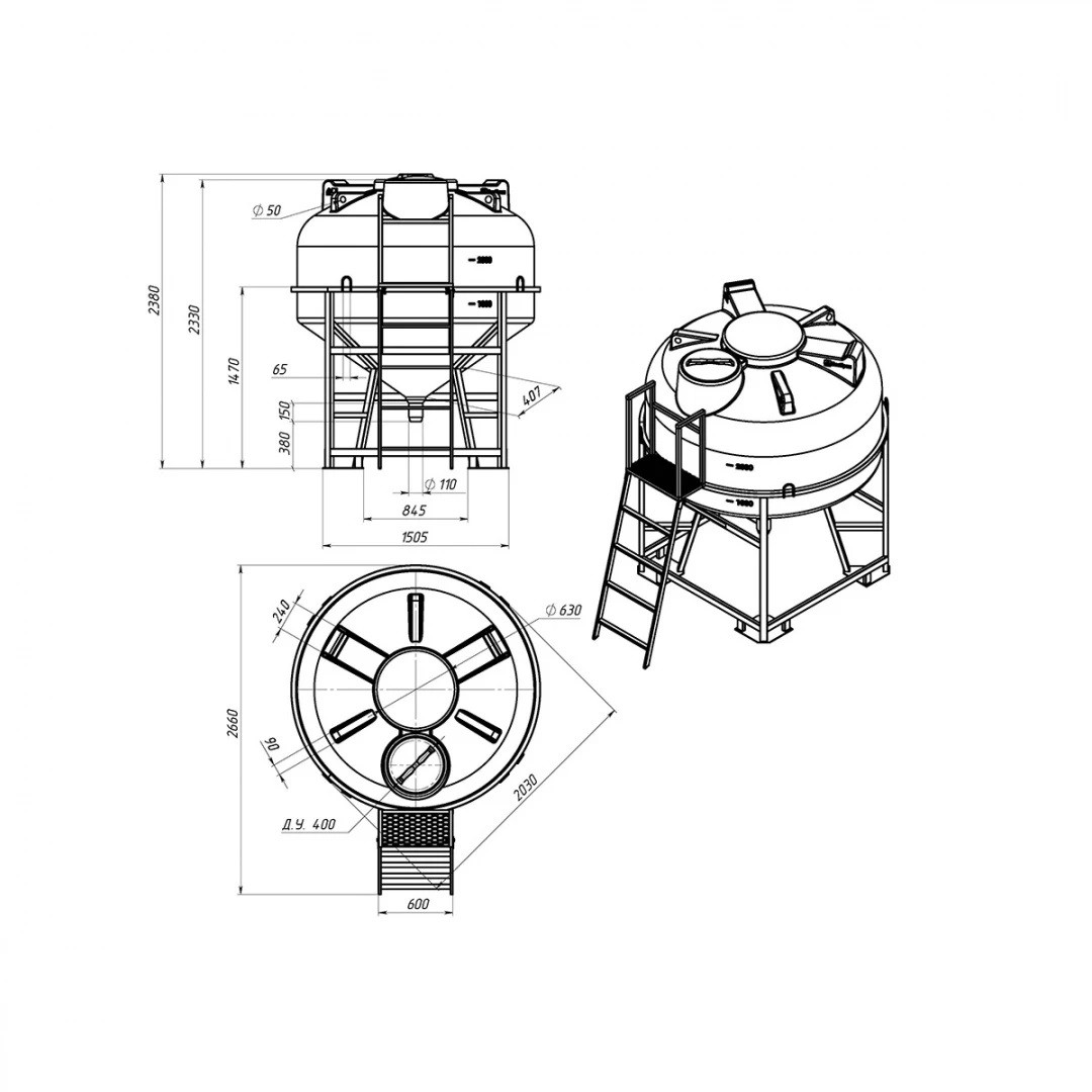 Емкость ЦКТ объемом 3000 литров с патрубком в обрешетке с лестницей – крупногабаритный цилиндрический резервуар с конусным дном, обеспечивающим дозированную подачу и полный слив хранящихся веществ.