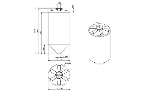 Емкость ФМ объемом 2000 литров – крупногабаритный цилиндрический резервуар с конусным дном, обеспечивающим дозированную подачу и полный слив хранящихся в баке веществ.
