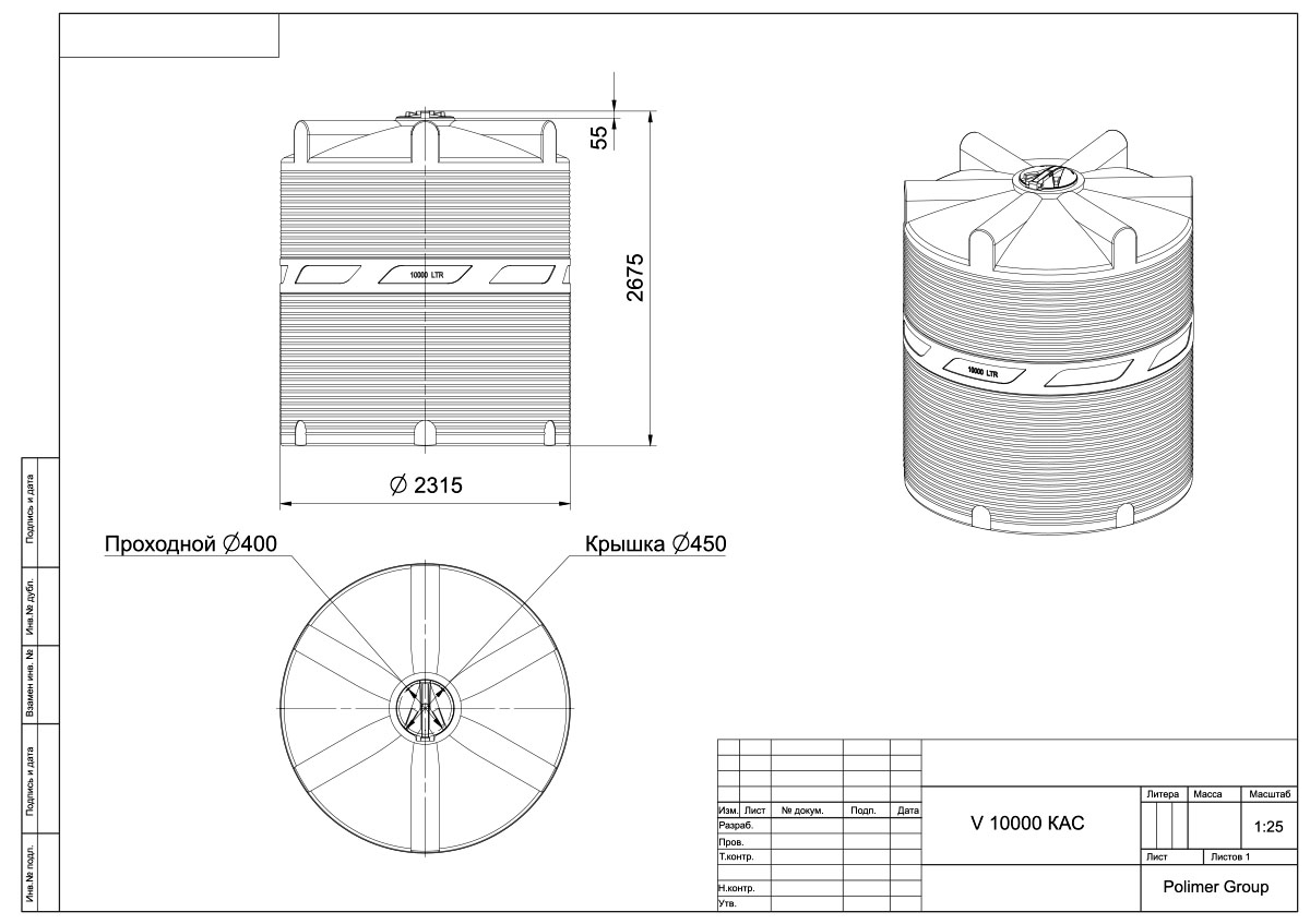 Емкость серии "КАС" объемом 10000 литров предназначена для хранения растворов агрохимии, удобрений, питьевой и технической воды, дизельного топлива и химических продуктов.
