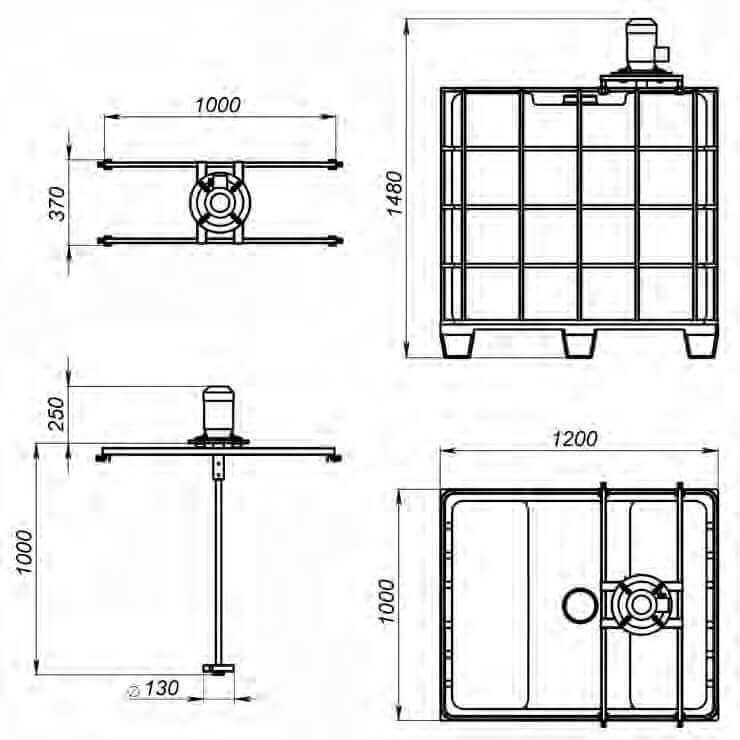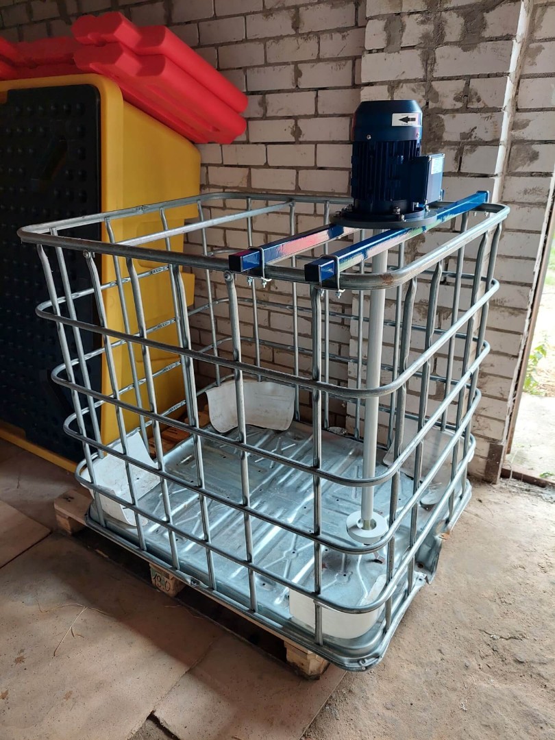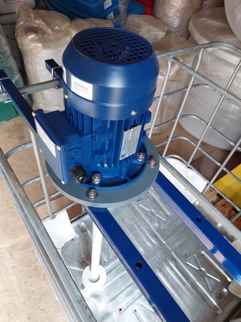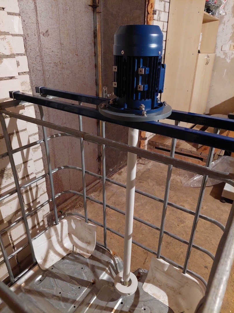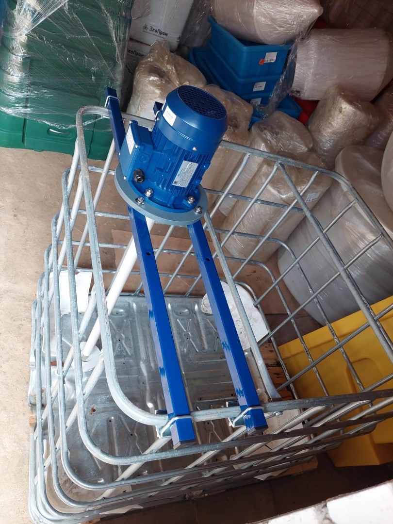 Стандартная конструкция мешалки включает в себя рабочее колесо специальной формы, вал, привод, жесткое крепление мешалки к валу привода и комплект специальных креплений на IBC контейнер (еврокуб).
