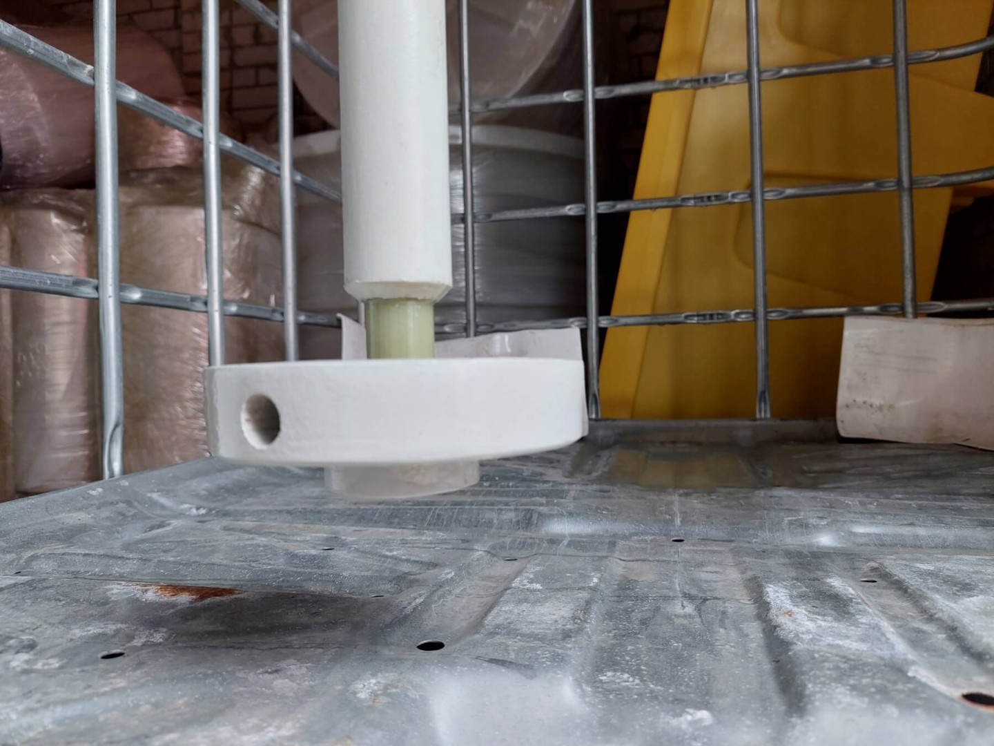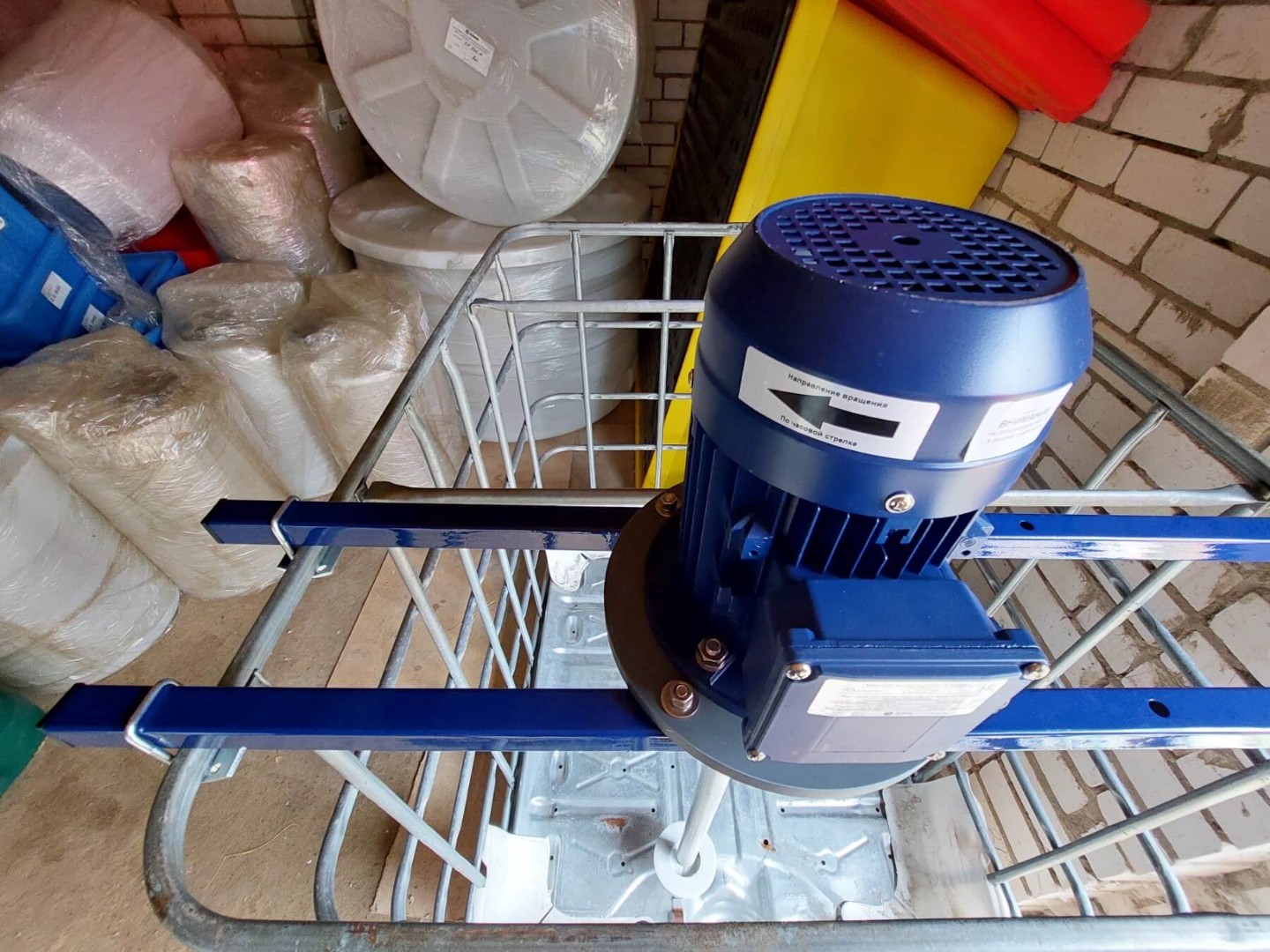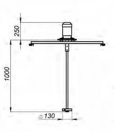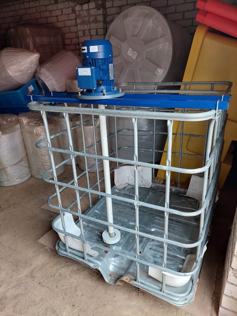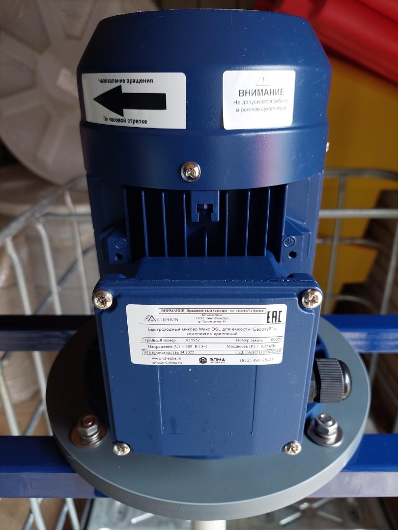Стандартная конструкция мешалки включает в себя рабочее колесо специальной формы, вал, привод, жесткое крепление мешалки к валу привода и комплект специальных креплений на IBC контейнер (еврокуб).