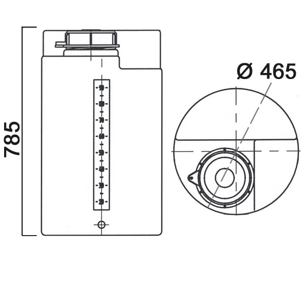Бак имеет цилиндрическую форму, в верхней части емкости предусмотрена плоская площадка для установки дозирующего насоса, мешалки, датчика уровня, расходомера. На корпус нанесена шкала для ориентировочного определения объема жидкости.
