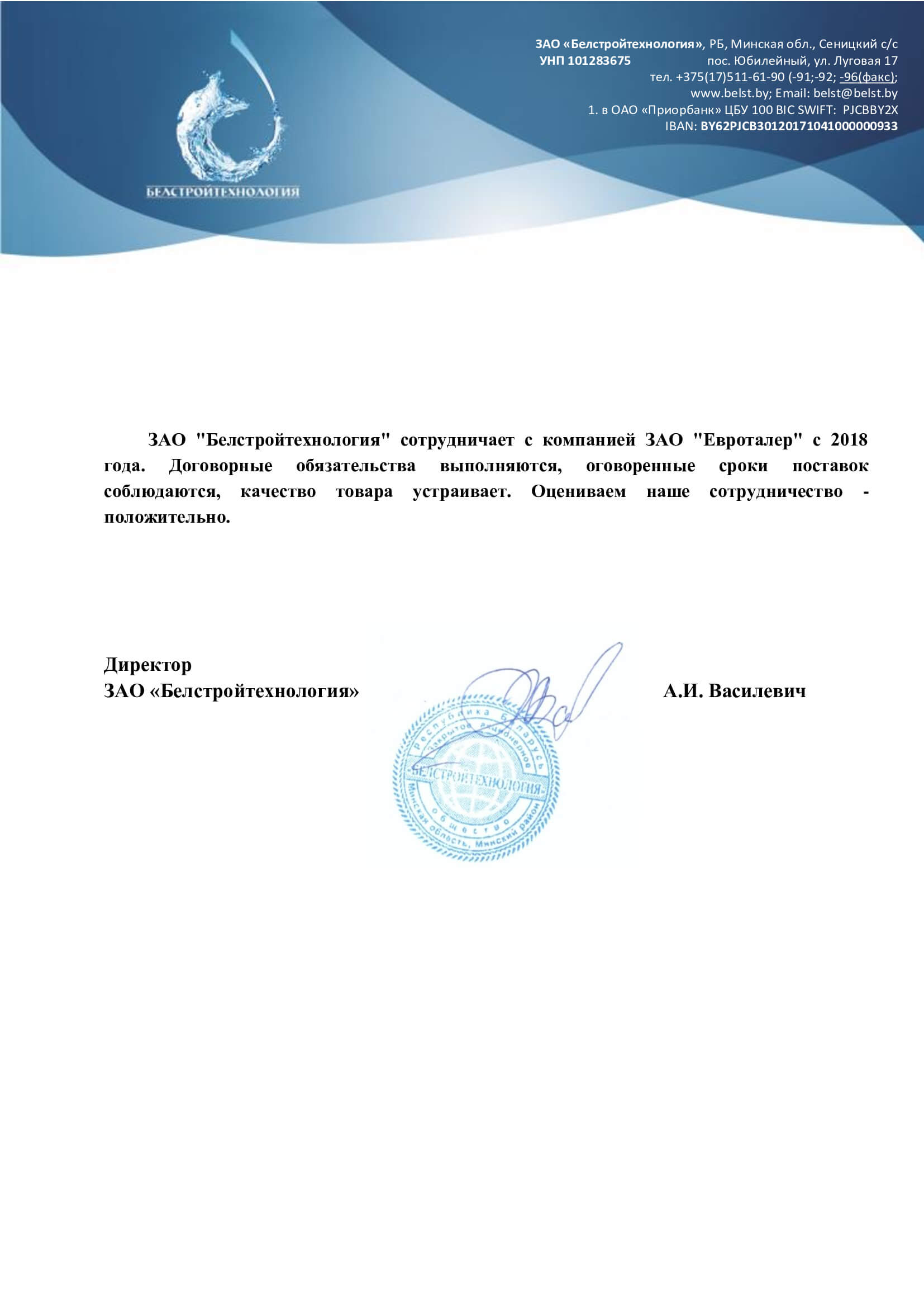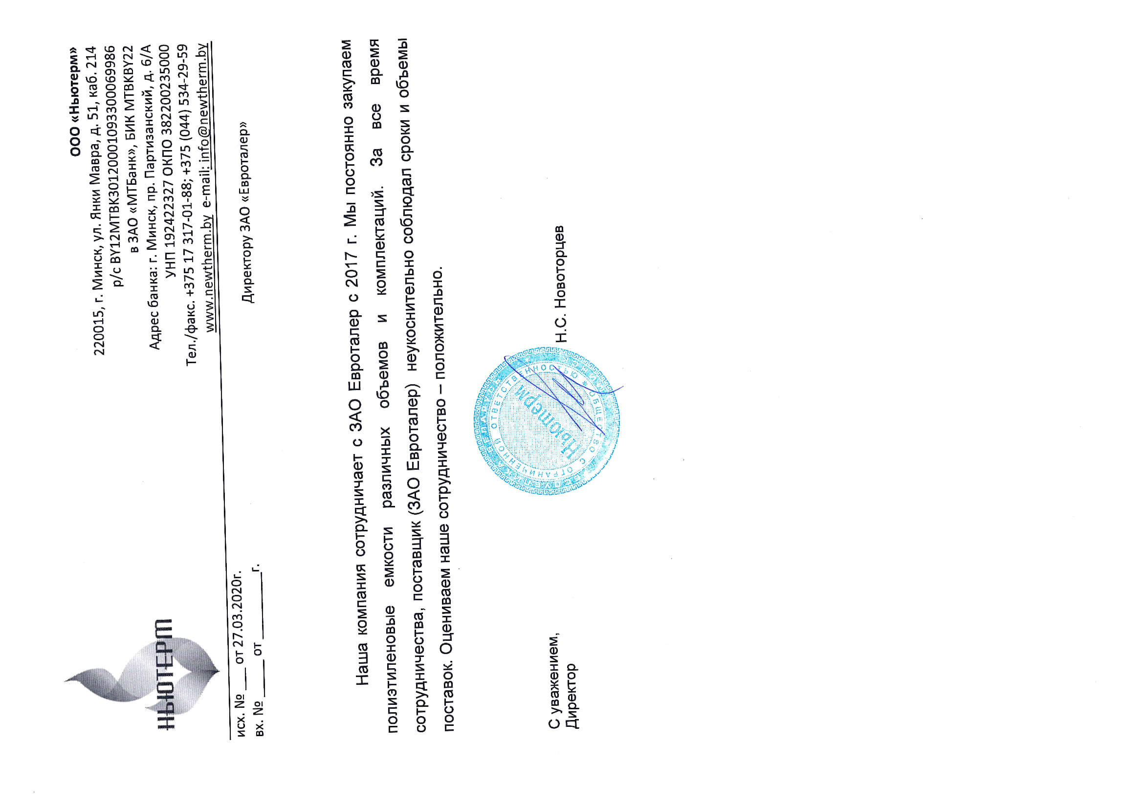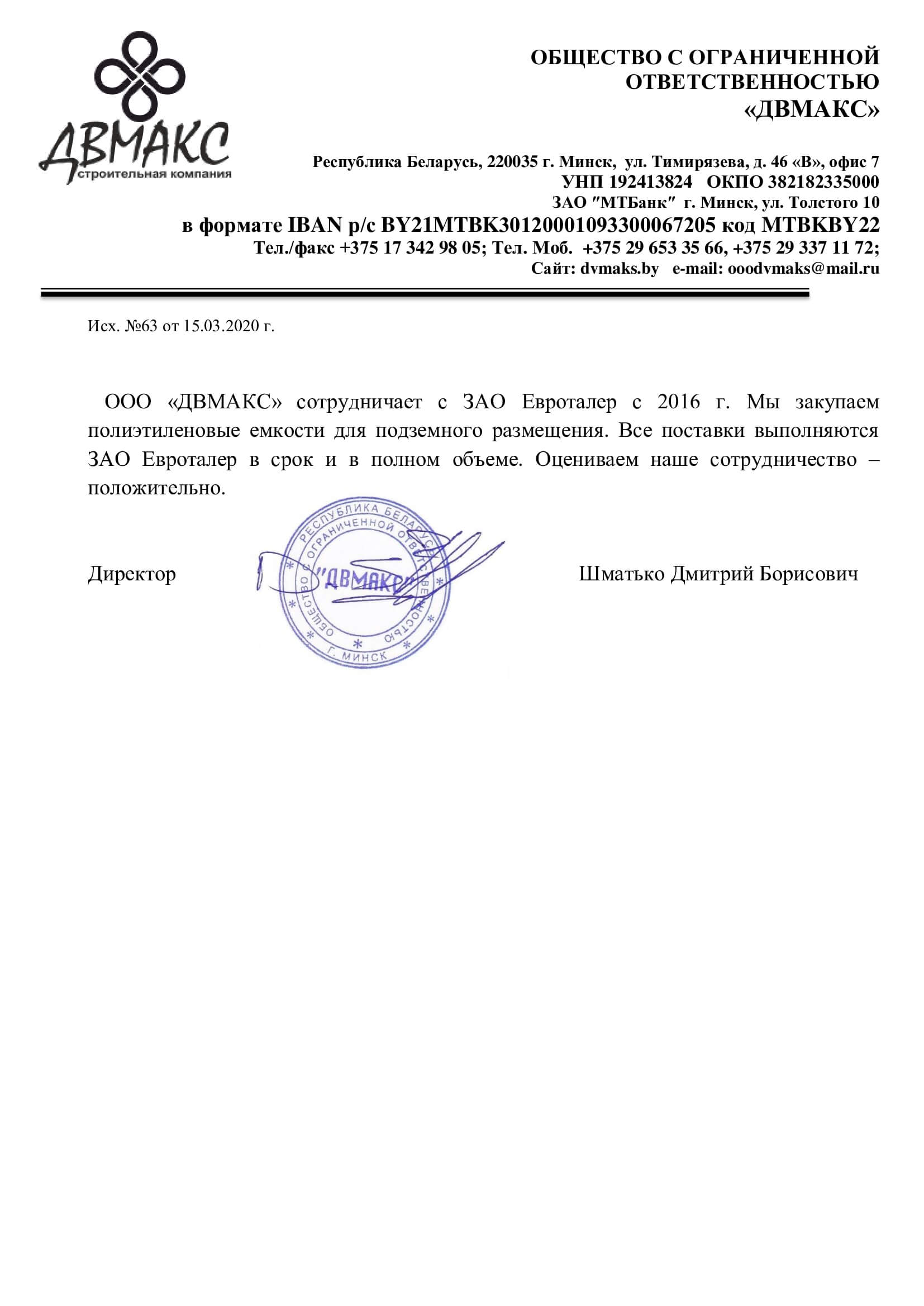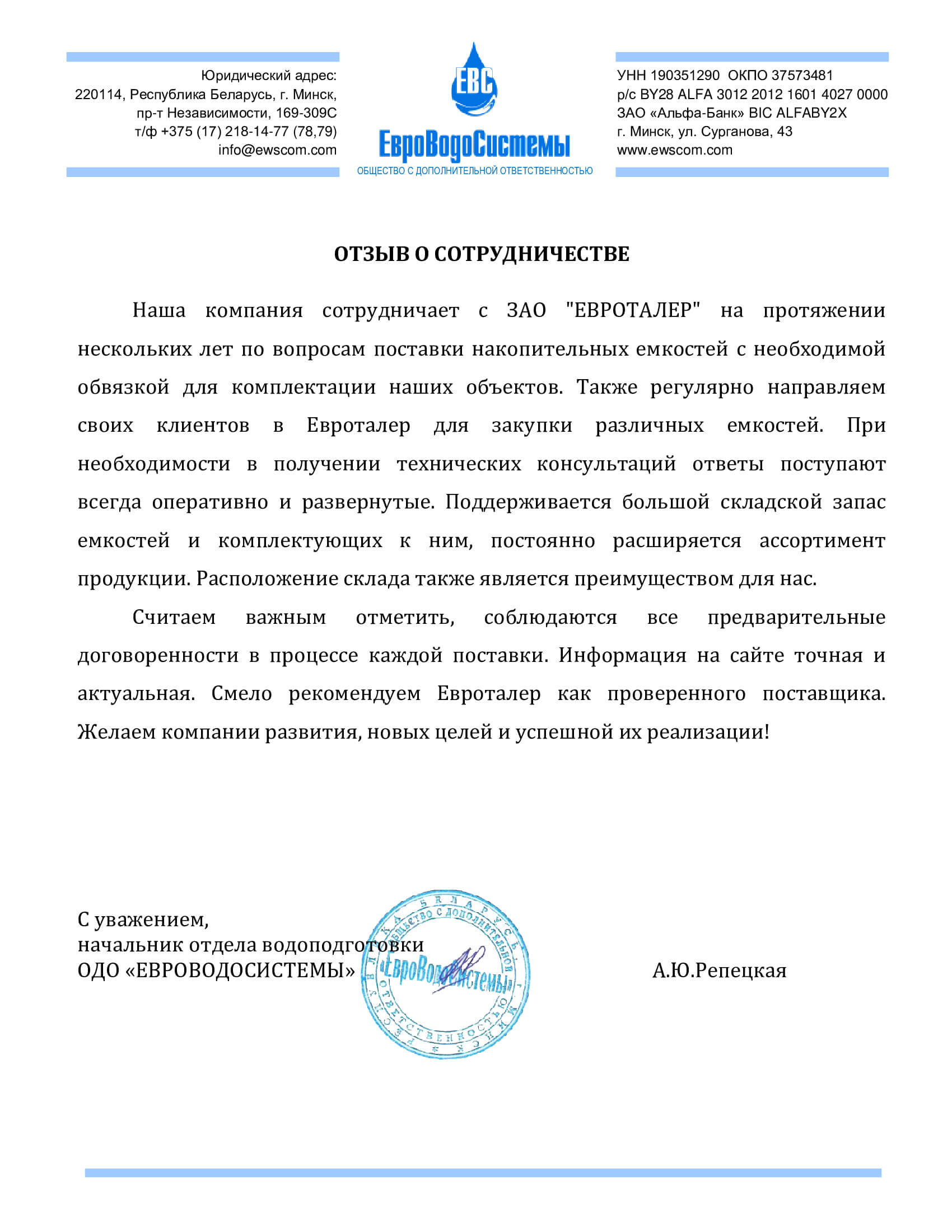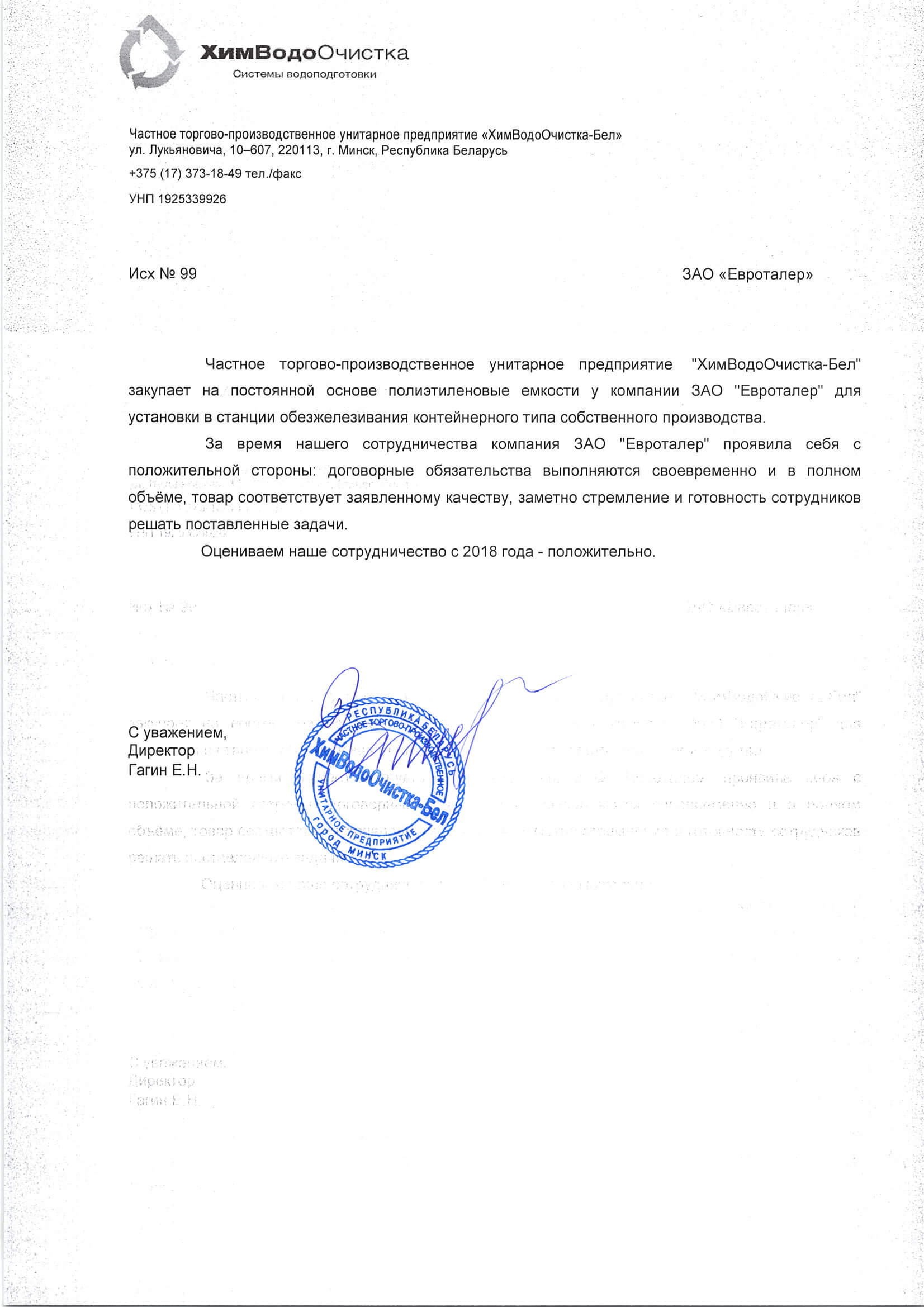 Компания ЗАО «Евроталер» обладает навыками и многолетним опытом успешной работы в области поставки в Республику Беларусь крупногабаритных полиэтиленовых емкостей для перевозки и хранения питьевой воды, жидких удобрений (КАС) и прочих жидкостей, а также иных изделий из пластика и полиэтилена, применяемых в строительстве, сельском хозяйстве и частном секторе.