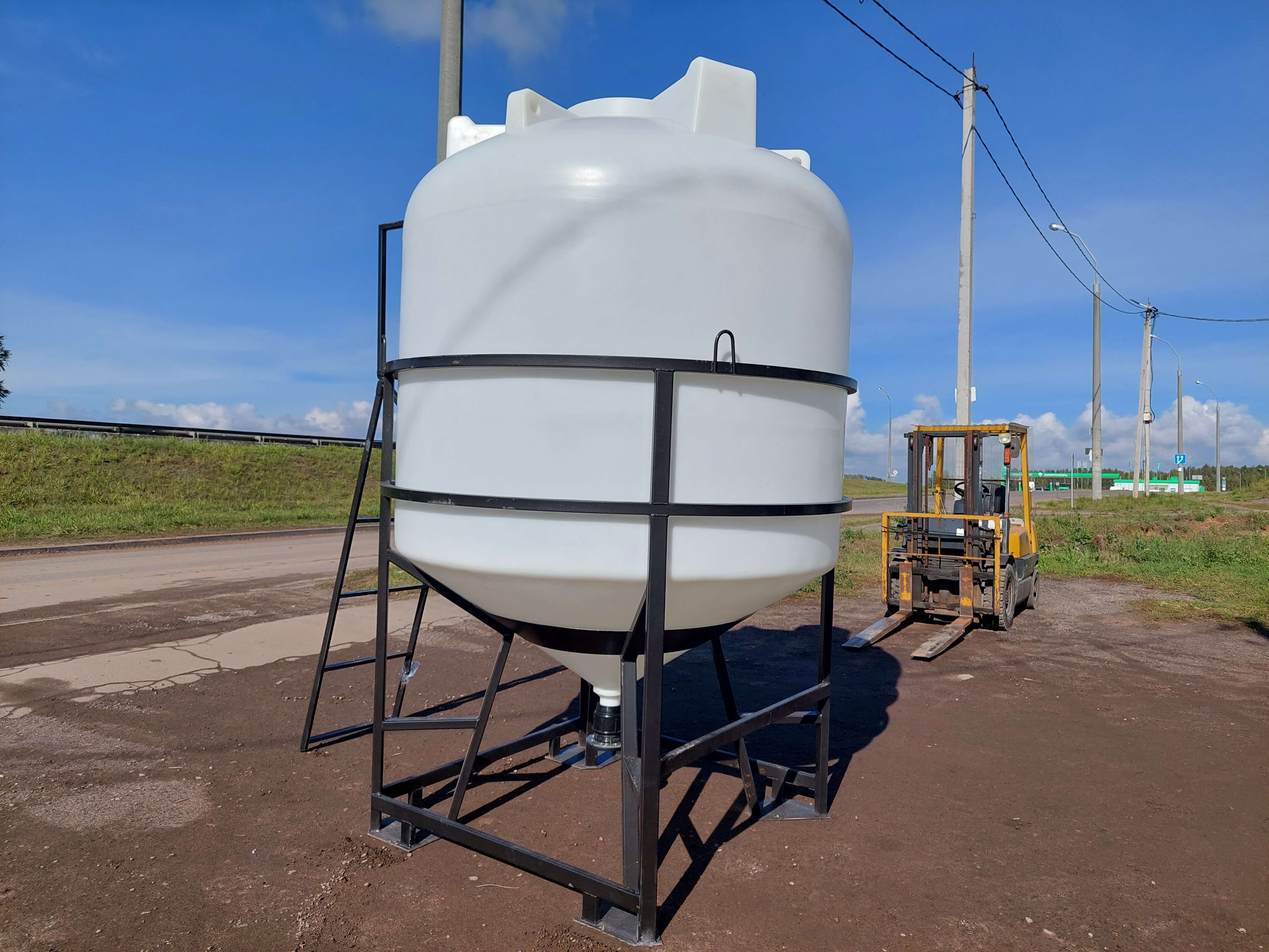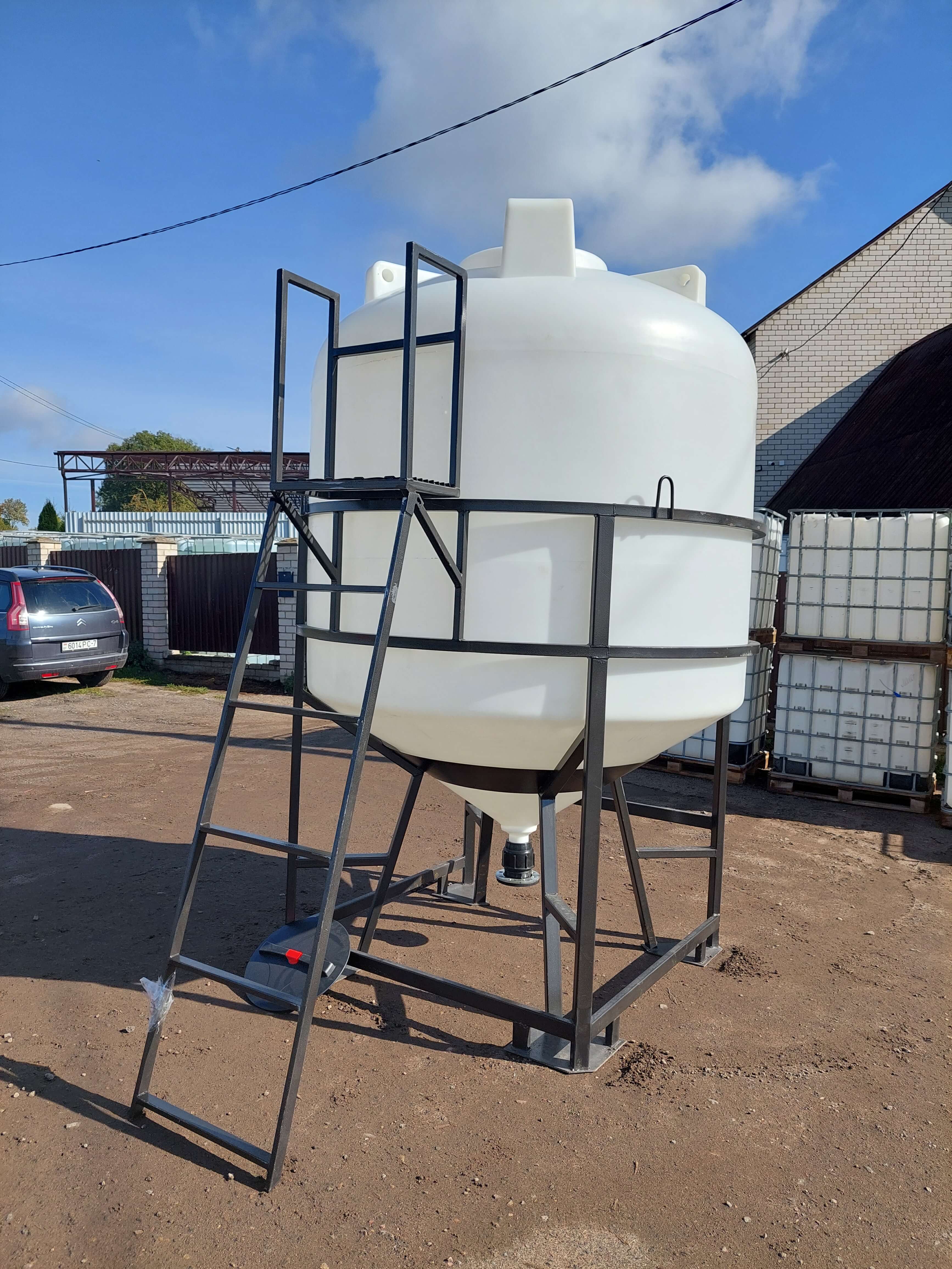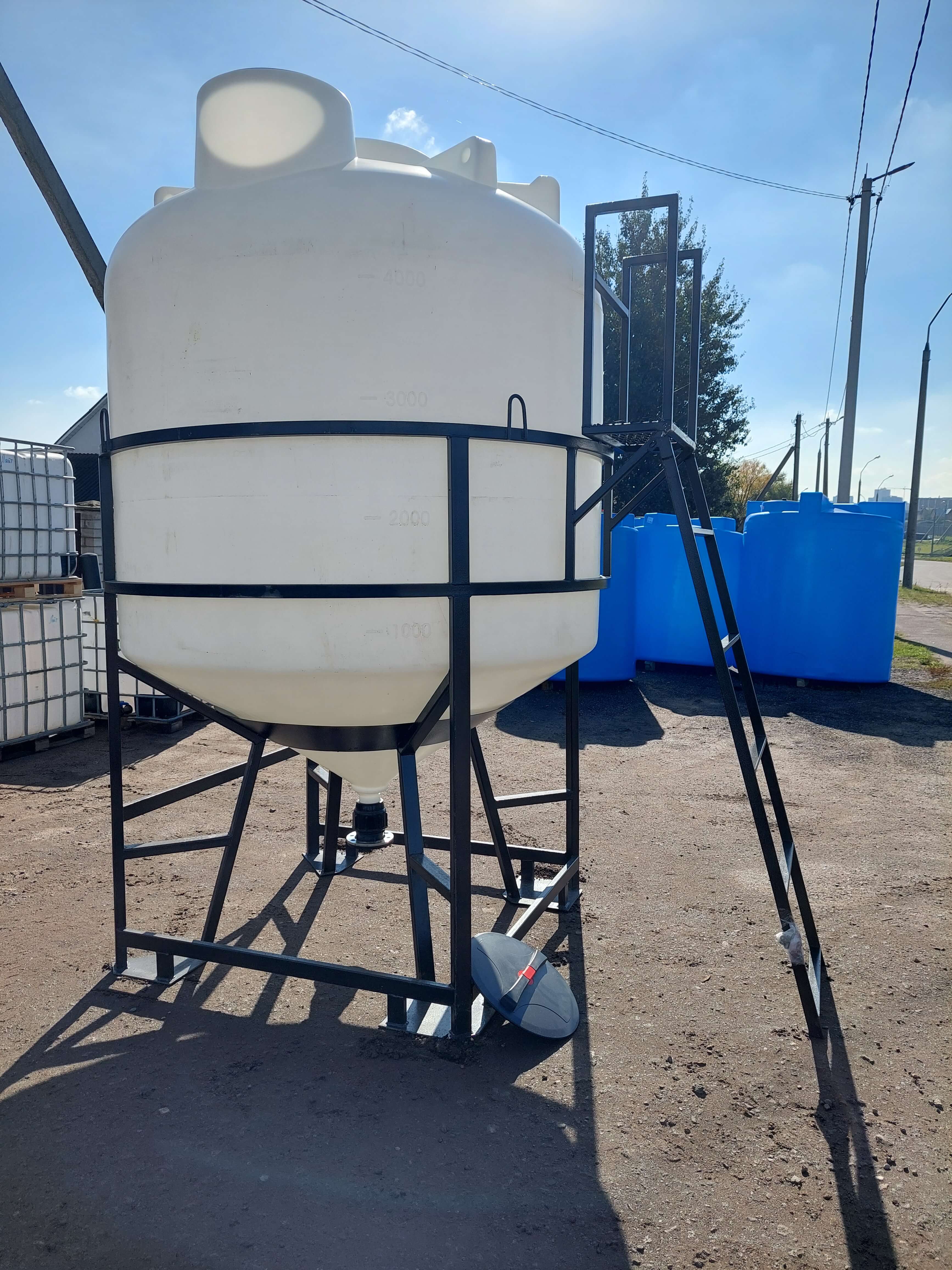 Задача: Подобрать промышленному предприятию РБ крупногабаритный цилиндрический резервуар с конусным дном. Объем емкости ЦКТ: от 3000 до 5000 литров. Металлическая обрешетка изделия должна быть оснащена лестницей со специальной площадкой и поручнями. Полный слив из емкости предусмотреть в нижней части конусного дна через цельнолитой нижний патрубок, который нужно укомплектовать обжимной муфтой с фланцем.
